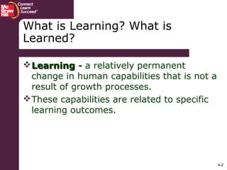 The document discusses learning theories and program design. It covers several learning theories including reinforcement theory, social learning theory, goal theories, need theories, expectancy theory, and information processing theory. It also discusses the learning process, instructional design, practice, feedback, and evaluating the effectiveness of training.