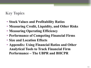 This chapter discusses measuring and evaluating the performance of banks and their competitors. It covers key profitability and risk ratios used to analyze performance, including return on equity, return on assets, net interest margin, and risk measures. The chapter also discusses how size and location can impact performance metrics and ratios. Regulatory reports like the UBPR and BHCPR provide detailed financial data and ratios to analyze bank and holding company performance over time.