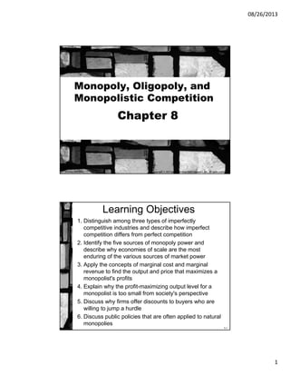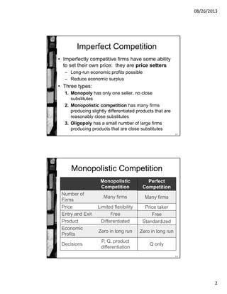 This document provides an overview of imperfect competition, including monopoly, oligopoly, and monopolistic competition. It discusses the key differences between imperfect and perfect competition. Specifically, it covers: 1) The three types of imperfect competition and how they differ from perfect competition in terms of number of firms, price flexibility, entry/exit, and potential for economic profits. 2) The five sources of monopoly power, with a focus on economies of scale as the most enduring source due to decreasing average costs. 3) How monopolists determine profit-maximizing output by setting marginal revenue equal to marginal cost, which results in a smaller output and higher price than the socially optimal level. 4) Examples are provided