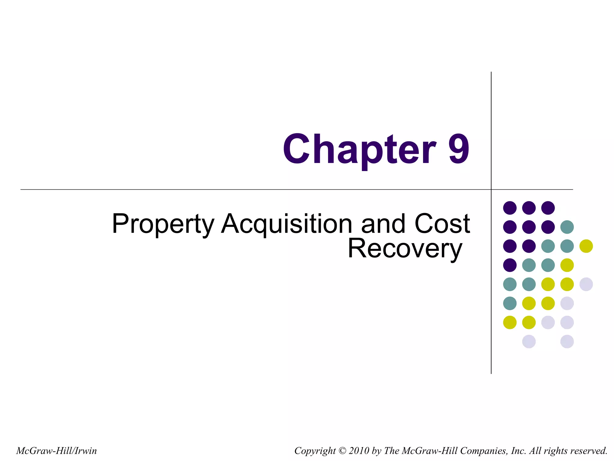 The document discusses cost recovery methods used under tax law to recover the costs of assets over time. It explains concepts of basis, adjusted basis, depreciation, amortization, and depletion. It provides details on determining cost recovery periods and methods for tangible and intangible assets. Examples are given for calculating depreciation of real property and personal property using MACRS tables.