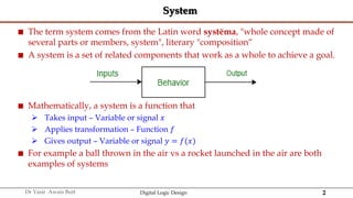 The document discusses digital systems and binary numbers. It defines a digital system as a system that processes, stores, and communicates information using discrete values. Digital systems have advantages like occupying minimum space and allowing for precise and accurate reproduction of information. The binary number system represents numbers using only two digits: 0 and 1. Each digit in a binary number represents a power of 2. The document also discusses converting between different number bases, like binary to decimal and vice versa, using place value and long division methods.