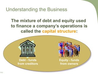 - Bonds are used to finance a company's operations and are considered debt, while equity refers to funds from owners. There are advantages like tax deductibility of interest expense but also risks like bankruptcy if obligations cannot be met.