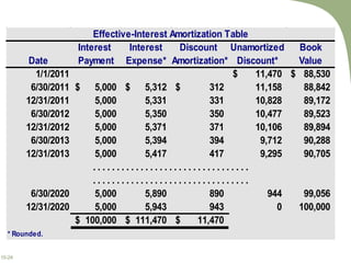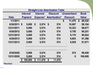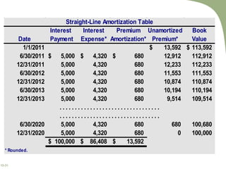 - Bonds can be issued at par value, at a discount if below par, or at a premium if above par. Discounts/premiums are amortized over the bond term using straight-line or effective interest methods to calculate periodic interest expense.