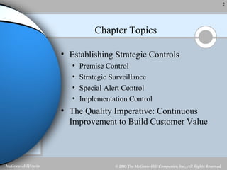 This document discusses strategic control and continuous improvement. It defines strategic control as tracking strategy implementation, detecting changes, and making adjustments. There are four types of strategic control: premise control checks strategy assumptions; strategic surveillance monitors internal/external events; special alert control reconsiders strategy due to unexpected events; and implementation control assesses strategy changes based on incremental actions. Continuous improvement focuses on customer satisfaction, measurement, and process improvement through techniques like total quality management (TQM), six sigma, ISO 9001, and balanced scorecards.