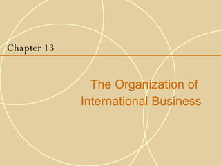 The document discusses organizational architecture and how it relates to international business strategy. It defines organizational architecture as including organizational structure, control systems, incentives, processes, culture, and human resources. It then examines each of these elements in detail. For example, it discusses different types of organizational structures like functional, divisional, matrix and how they relate to different stages of international expansion. It also analyzes how factors like performance ambiguity and need for integration vary based on whether a firm pursues a localization, international, global standardization or transnational strategy. The matrix structure is said to be common for firms pursuing a transnational strategy due to their high need for coordination across borders.