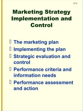 This chapter discusses marketing strategy implementation and control. It covers implementing the marketing plan, evaluating performance, and taking corrective actions. The key aspects are: