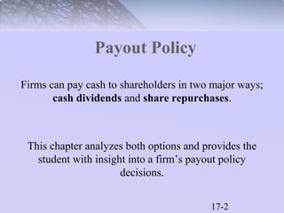 This document discusses a firm's payout policy and the two main ways firms pay cash to shareholders: cash dividends and share repurchases. It analyzes the options of paying dividends versus repurchasing shares and how each affects shareholder wealth. The document also discusses Modigliani and Miller's dividend irrelevance proposition that under perfect markets, dividend policy does not impact firm value.