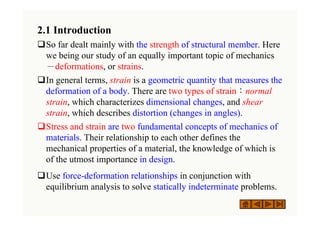 This document summarizes key concepts from a chapter on strain in mechanics of materials. It discusses two main types of strain - normal and shear - and how stress and strain define a material's mechanical properties. It then focuses on axial deformation and stress-strain diagrams, describing how tensile tests are conducted to generate these diagrams for materials like steel. Key points on the stress-strain curve are identified, such as proportional limit, yield point, ultimate stress, and how they relate to a material's elastic region and factors of safety in design.