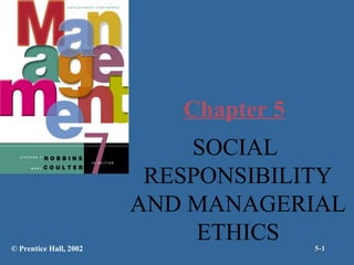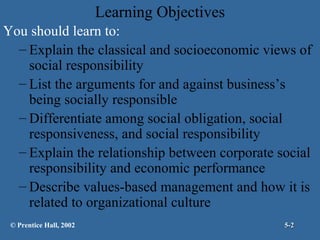 This document summarizes key concepts around social responsibility and managerial ethics. It discusses classical and socioeconomic views of social responsibility, as well as differences between social obligation, responsiveness, and responsibility. It also outlines factors that influence ethical behavior, like individual characteristics and organizational culture. Overall, the document provides an overview of perspectives on a company's role in society and improving ethical standards within organizations.