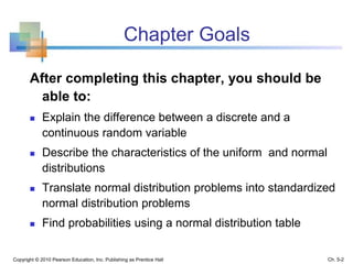 This chapter discusses continuous random variables and probability distributions, including the normal distribution. It introduces continuous random variables and their probability density functions. It describes the key characteristics and properties of the uniform and normal distributions. It also discusses how to calculate probabilities using the normal distribution, including how to standardize a normal distribution and use normal distribution tables.