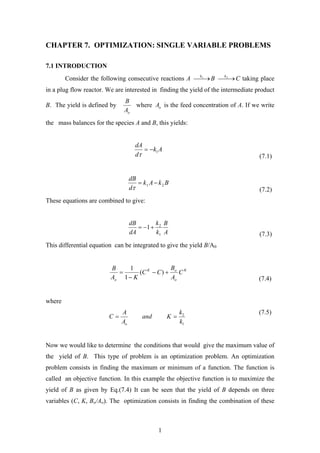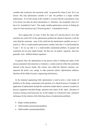 This document discusses optimization problems involving a single variable. It begins by introducing optimization problems and defining key concepts like objective functions, constraints, and optimality conditions. It then presents methods for solving single variable optimization problems both analytically and numerically. Analytically, it discusses using derivatives to find maxima and minima, and classifying functions as unimodal, convex, or concave. Numerically, it describes bracketing methods to bound the solution and the Newton-Raphson method requiring derivatives. It also introduces the golden section search method, a region-elimination technique.