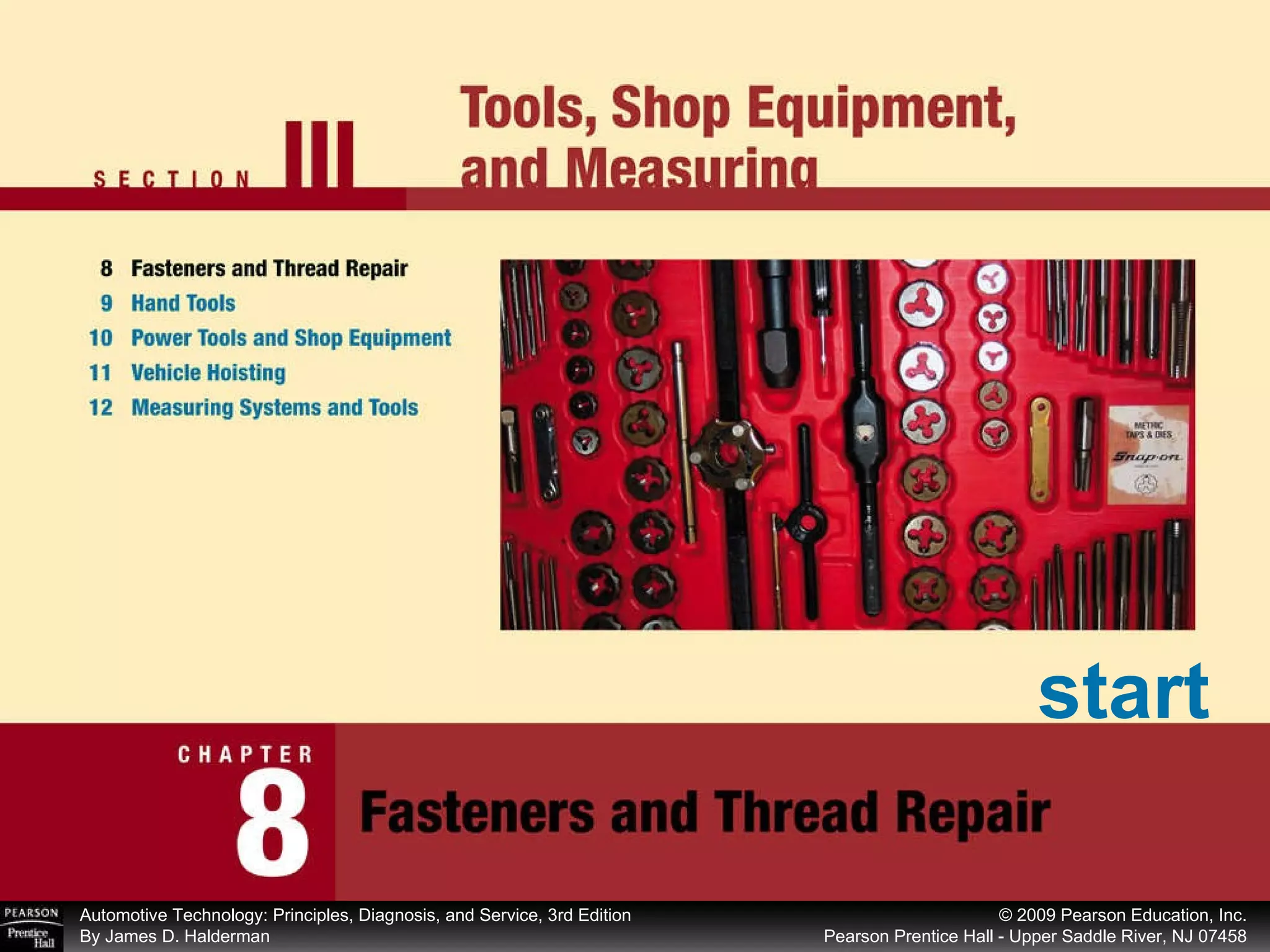 The document discusses various types of threaded and non-threaded fasteners used in automotive applications. It describes bolts, nuts, washers, rivets, snap rings, and other fasteners. Key terms are defined, such as bolt grade, tensile strength, and thread pitch. Proper use and installation of different fasteners is also covered.