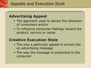The document discusses advertising appeals and execution styles. It identifies two broad categories of appeals - informational/rational appeals that focus on practical benefits, and emotional appeals that relate to social/psychological needs. Various execution techniques are also outlined, such as straight sell messages, testimonials, and humor. The document then provides details on creative tactics for print, television, and online advertising, including components like headlines, visuals, and layout. It concludes with guidelines for evaluating creative work against objectives and appropriateness.