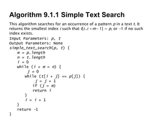 The document describes algorithms for text searching and pattern matching. It presents several algorithms for tasks like simple text search, Rabin-Karp search, Knuth-Morris-Pratt search, Boyer-Moore search, edit distance, approximate matching, don't-care search, and epsilon-NFA matching using pattern trees. The algorithms are explained through pseudocode with input/output parameters and complexity analysis provided for some.