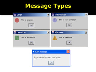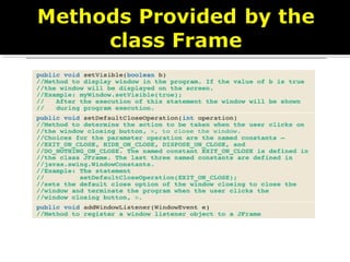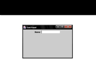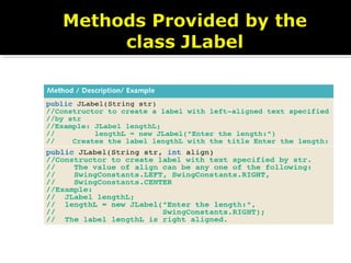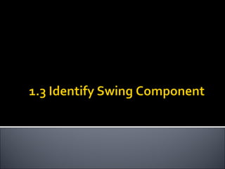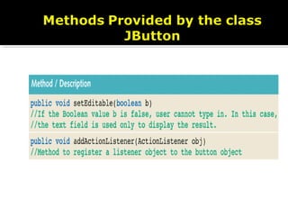 The document discusses Java GUI components from the Abstract Window Toolkit (AWT) and Swing toolkit. It defines AWT as a set of APIs used to create GUI objects like buttons and windows. It describes common AWT containers like Frame, Panel, Dialog and Applet. It then introduces Swing as an enhanced GUI toolkit and lists some common Swing components in packages like javax.swing. The document provides examples of creating and using common Swing components like JFrame, JLabel, JButton, JCheckBox.