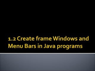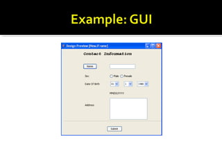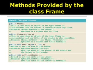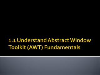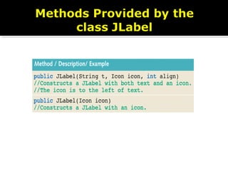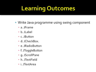 The document discusses Java GUI components from the Abstract Window Toolkit (AWT) and Swing toolkit. It defines AWT as a set of APIs used to create GUI objects like buttons and windows. It describes common AWT containers like Frame, Panel, Dialog and Applet. It then introduces Swing as an enhanced GUI toolkit and lists some common Swing components in packages like javax.swing. The document provides examples of creating and using common Swing components like JFrame, JLabel, JButton, JCheckBox.