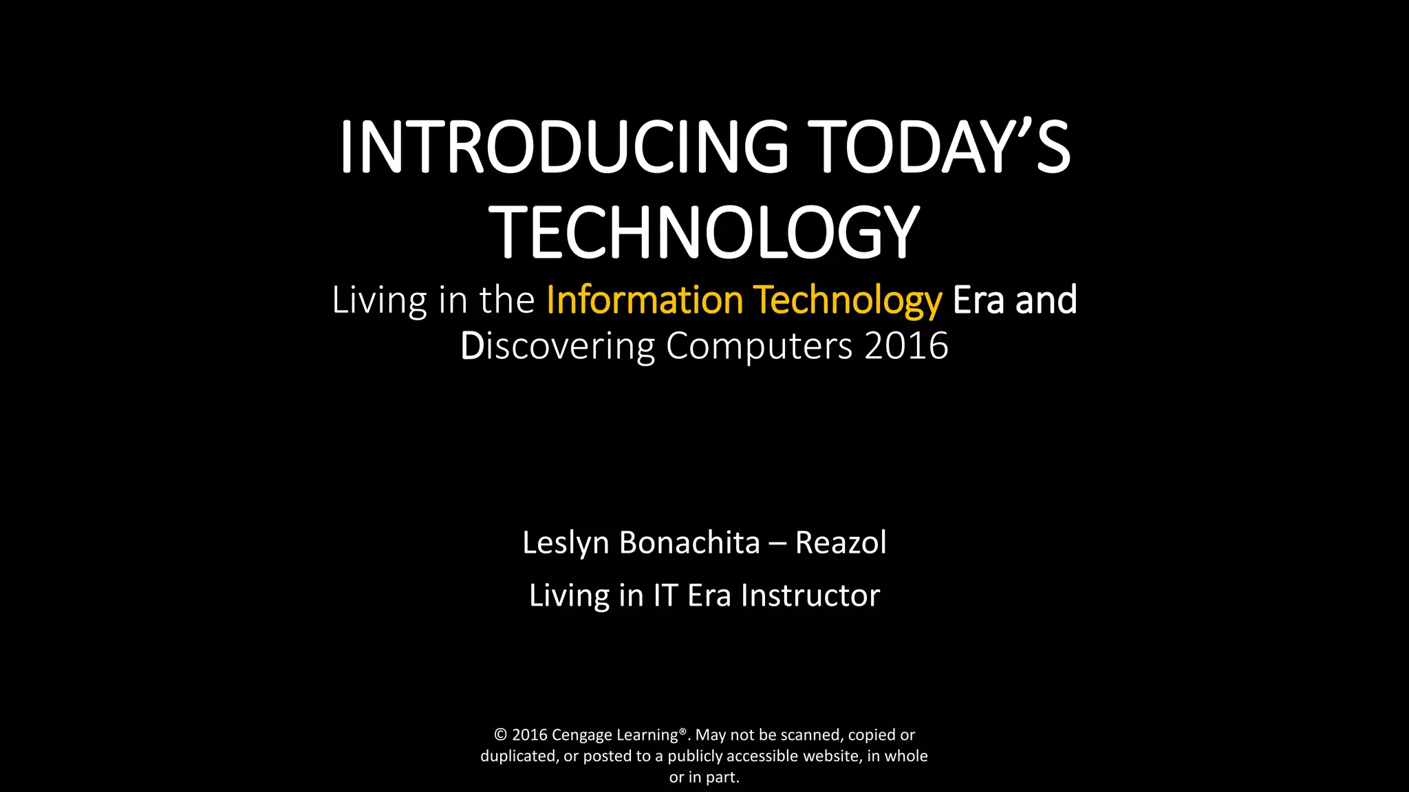 The document provides an overview of topics to be covered in a lesson about living in the Information Technology Era. The objectives include defining ICT and tracing technology evolution, differentiating device types, and describing the relationships between data, information, and key Internet concepts. It also covers digital security risks, operating systems versus applications, and how society uses technology in various fields. The lesson defines key terms and discusses the history and components of computers, including inputs, outputs, storage, and the system unit.