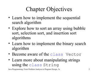 This chapter discusses searching and sorting algorithms for arrays and strings. It covers sequential search, binary search, bubble sort, selection sort, and insertion sort. It also discusses using the Vector class to implement dynamic arrays and provides examples of searching voter data and converting strings to pig latin.
