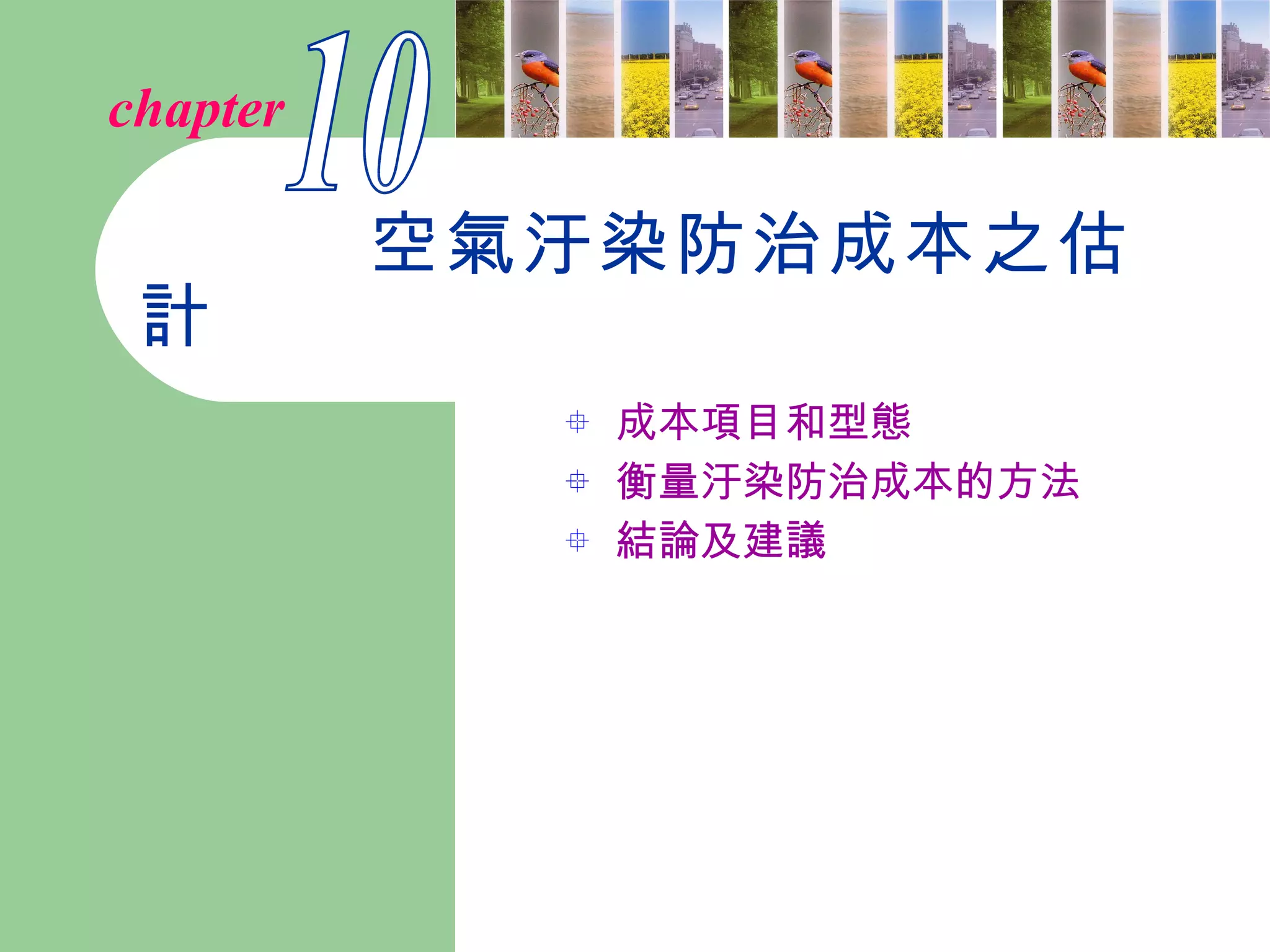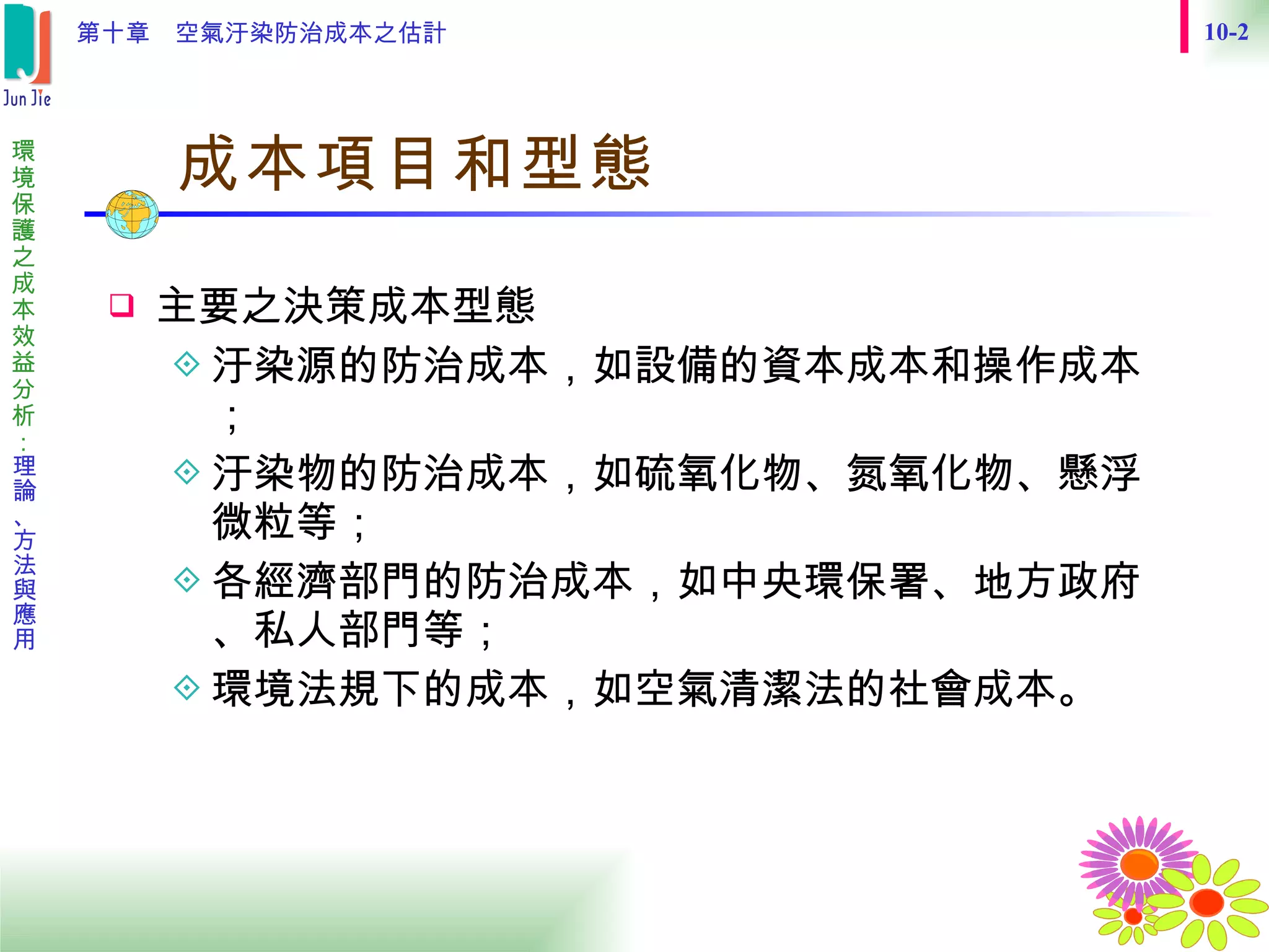工程模擬法 ( Engineering Simulation ) C n = C o ( S n /S o ) b ; C n = a ( S n ) b ; 控制設備成本函數 脫硫集氣成本函數( Flue-Gas-Desulfurization Cost Function) : C T (資本成本) =[36.05 D s F r ( P/n ) 0.65 n r 0.85 +18.39 D a S 0.67 ] I p ( 1+ C I ) 5 C OM (操作維修成本) =[ A s P ( I s /235 ) +8760 A a S ( I a /I b ) ] L + C L + MLC r 6