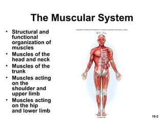 This document provides an overview of the muscular system chapter in a textbook. It discusses the organization of muscles in the body, their functions, and connective tissues. It also describes specific muscle groups like the muscles of the head and neck, trunk, shoulder, and hip and lower limb. Diagrams show the muscles and their attachments, shapes, actions, and innervation. The summary focuses on key muscle groups like the muscles of mastication, swallowing, respiration, and the shoulder.