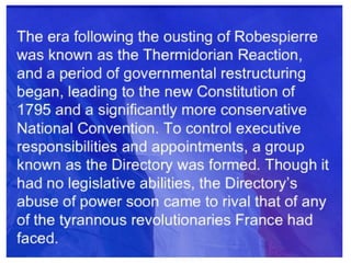 This document provides an overview of the French Revolution and Napoleon's rise to power between 1789-1815. It discusses the social structure and economic troubles under the Old Regime, the storming of the Bastille, the establishment of the National Assembly, the Declaration of the Rights of Man, the overthrow of the monarchy and establishment of a republic, the Reign of Terror led by Robespierre, and Napoleon's eventual seizure of power and establishment of the First French Empire.