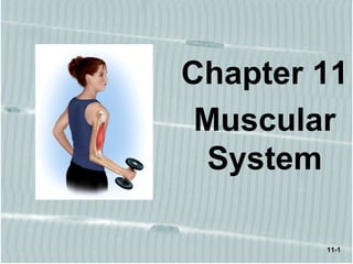 The document discusses the anatomy and physiology of the muscular system, describing the microscopic structure of skeletal muscle including muscle fibers, myofilaments, sarcomeres, and motor units. It explains how skeletal muscle cells are made up of bundles of myofibrils containing thick and thin filaments that overlap to allow contraction, and are innervated by motor neurons to allow voluntary movement. The different types of muscle tissue and their functions are also introduced.