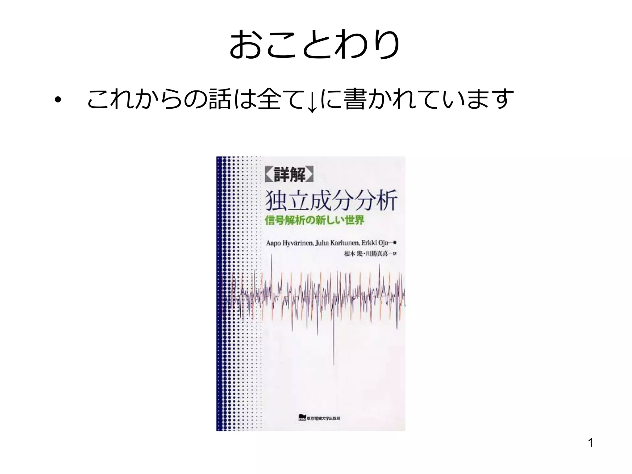 独立成分分析とは? • 必要なのは独立性。 • ガウス分布、ダメ、ゼッタイ。 • 目的関数いろいろ、解き方もいろいろ。 2