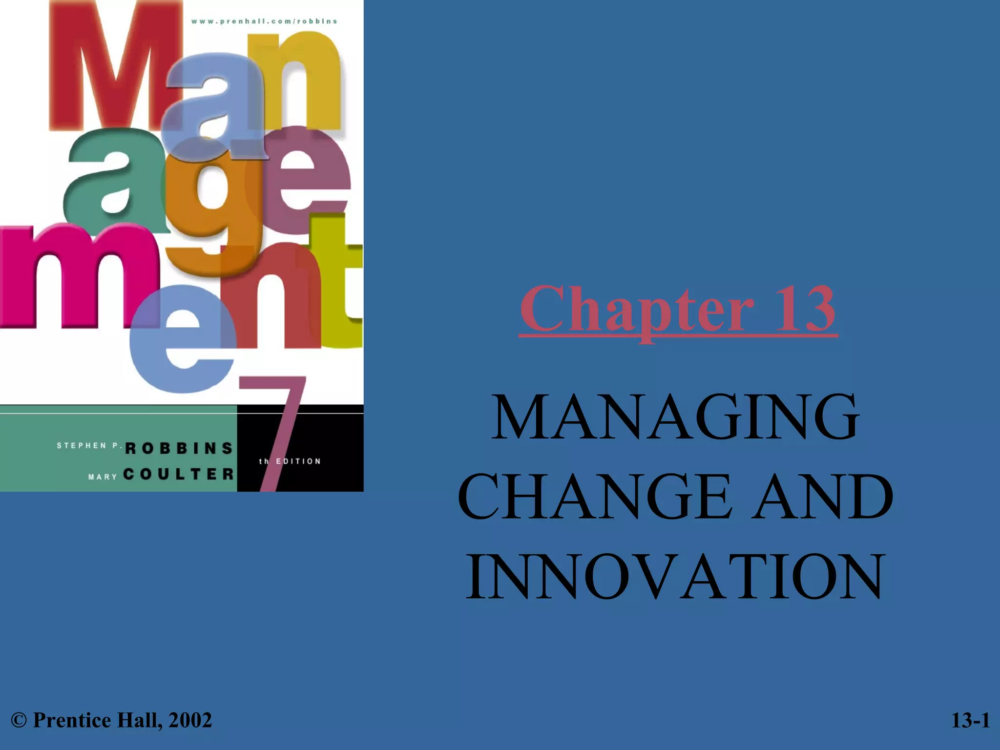 This document discusses managing change and innovation in organizations. It begins by outlining learning objectives about different views of change, resistance to change, and stimulating innovation. It then defines change and discusses external and internal forces for change. It describes Lewin's three-step model of the change process and contrasts the "calm waters" and "white-water rapids" metaphors for change. It also outlines three categories of change: structure, technology, and people. The document provides techniques for initiating change and reducing resistance to change. It discusses contemporary issues like changing organizational culture, quality improvement programs, process reengineering, and handling employee stress. It ends by differentiating between creativity and innovation and describing how organizations can stimulate and nurture