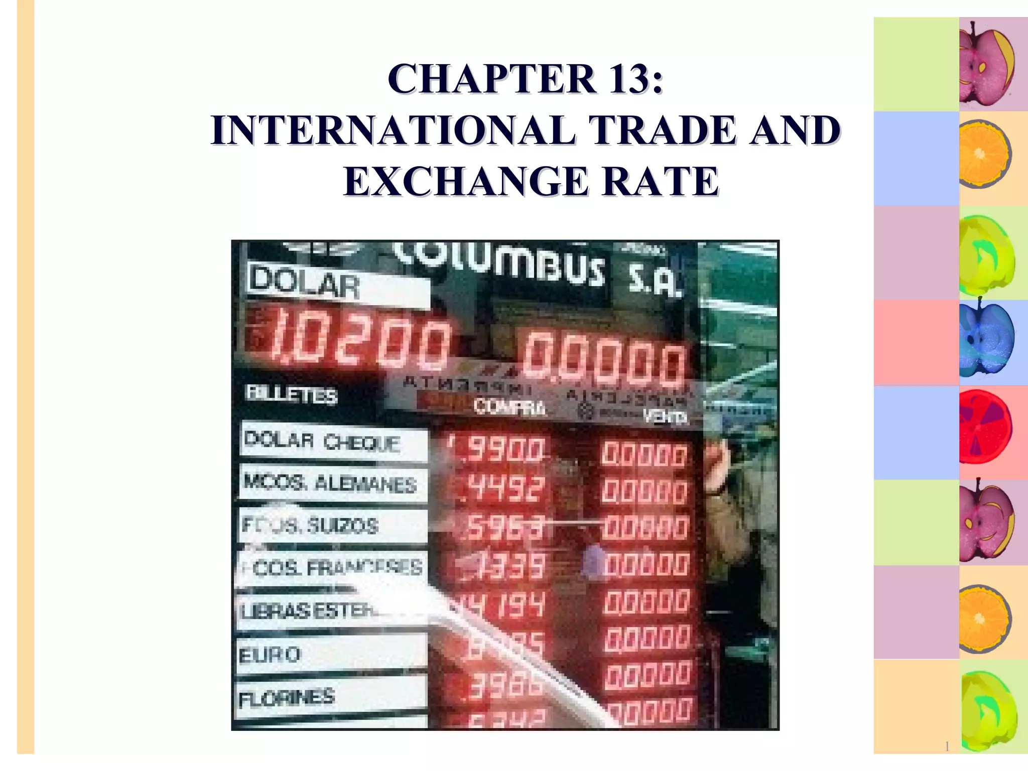 This document summarizes key concepts in international trade and exchange rates discussed in Chapter 13. It covers absolute and comparative advantage, types of trade barriers, components of the balance of payments, and exchange rate systems. Country A has an absolute advantage in cars and Country B has an advantage in rice, but Country B has a lower opportunity cost of cars, so it should specialize in car production. The current account records trade in goods, services, income, and transfers. Exchange rates can be fixed, flexible, or managed to balance trade and stability.