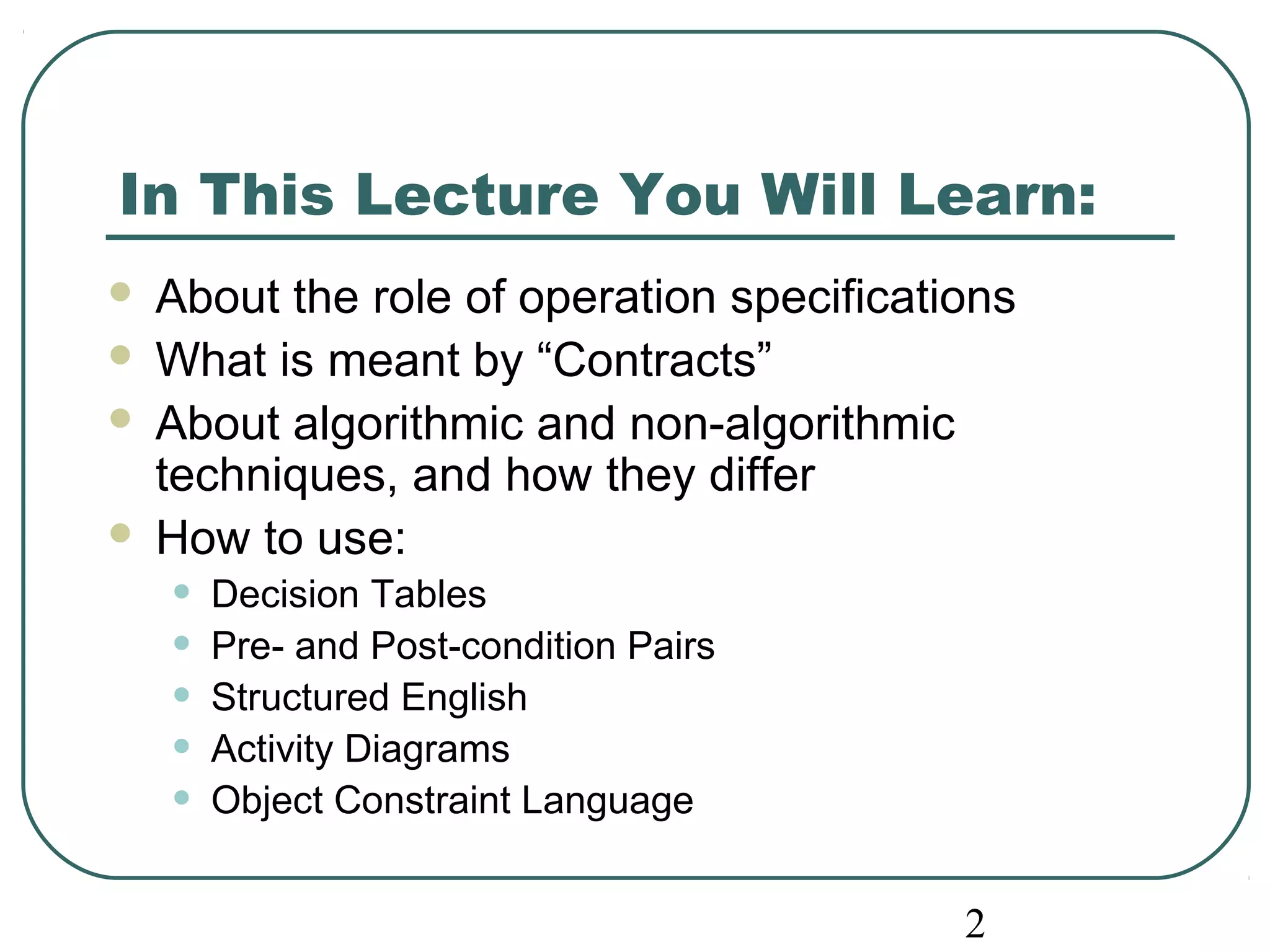 This document discusses different techniques for specifying software operations, including contracts, pre-and post-conditions, decision tables, structured English, activity diagrams, and the Object Constraint Language (OCL). Contract-based specifications focus on inputs and outputs without detailing implementation. Non-algorithmic techniques like decision tables and pre-post conditions specify what an operation should achieve without how. Algorithmic methods like structured English and activity diagrams describe the logic and flow. OCL uses context, properties, and operations to write constraints for modeling elements. The document provides examples and explanations of how to apply these various specification approaches.