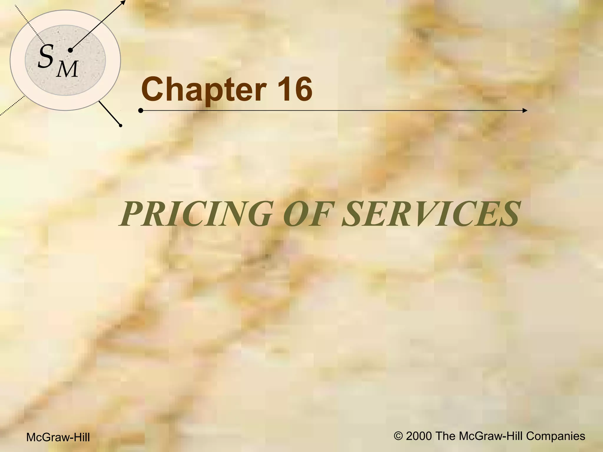 This document discusses pricing strategies for services. It identifies four ways customers can define value: low price, getting everything wanted, quality for the price paid, and all received for all given. The document then outlines pricing strategies companies can use for each customer definition of value, such as discounting for low price, prestige pricing for everything wanted, value pricing for quality/price, and bundling for all received/given. Overall, the key message is that pricing strategies for services should be tailored based on how a specific customer segment defines value.