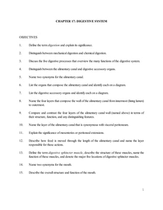This document outlines the objectives and content covered in a chapter on the digestive system. It discusses the main parts and functions of the digestive system, including the organs that make up the alimentary canal (e.g. mouth, esophagus, stomach, intestines) and accessory organs (e.g. liver, gallbladder, pancreas). It describes the four layers of the alimentary canal wall, how food moves through peristalsis, and the roles of sphincter muscles. Key details are provided on the structure and functions of the mouth, stomach, pancreas, liver and other digestive organs.