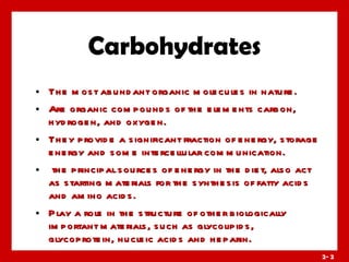 The document discusses carbohydrates and their role in nutrition. It covers the classification of carbohydrates into monosaccharides, disaccharides, and polysaccharides. Key carbohydrates discussed include glucose, fructose, galactose, sucrose, lactose, maltose, starch, glycogen and dietary fiber. Sweeteners and their use, as well as diabetes and cutting back on sugar intake are also summarized.
