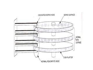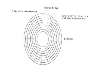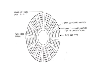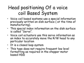 The document discusses the different components and technologies used in hard disk drives for head positioning and data storage. It covers voice coil actuators, servo information, closed-loop positioning, wedge, embedded and dedicated servo types. It also describes disk geometry concepts like tracks, sectors, cylinders and calculates storage capacity. Technologies like interleave, zone bit recording, write pre-compensation, master boot record, clusters, logical vs physical formatting are summarized.