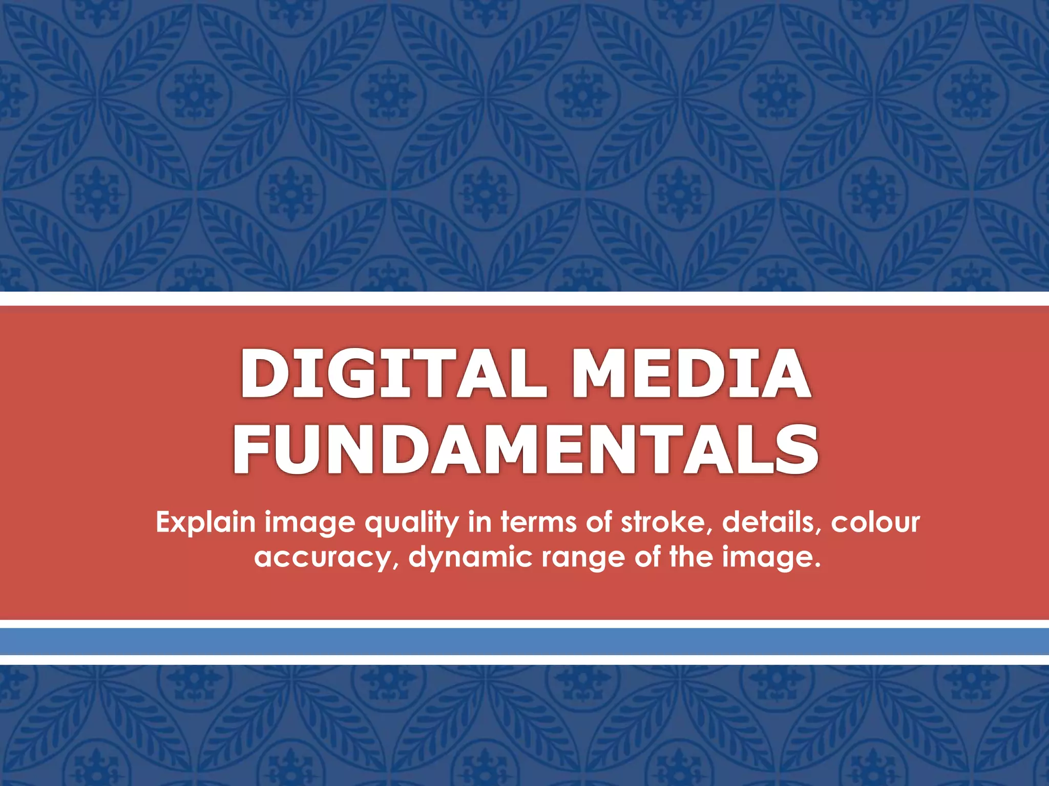 Image quality is determined by factors like sharpness, noise, dynamic range, tone reproduction, contrast, color accuracy and distortion. Sharpness refers to detail while noise is random pixel variations. Dynamic range is the light levels an image can capture. Tone reproduction is the relationship between scene luminance and brightness. Contrast affects loss of detail. Color accuracy and distortion can also impact quality. Software filters like blurring the background can improve an image's quality by making the subject stand out more, though they cannot add new detail. Frequency modulation screening randomly distributes dots to simulate gray levels and keeps dots the same size, varying frequency. It eliminates moiré effects seen with traditional screening. Higher resolution images, like 300 ppi versus 72