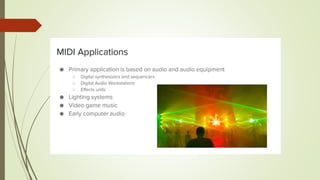 Sound is produced by the vibration of matter which creates oscillations in the surrounding air. These oscillations form a waveform pattern which repeats at regular intervals to produce periodic sounds from sources like musical instruments. A computer represents sound digitally by taking regular samples of a sound waveform's amplitude and storing the values. Common audio file formats include WAV, MP3, MIDI and more. Animations are created by displaying a series of pictures or frames in sequence to simulate movement, and there are different software and techniques used to produce different types of animations.