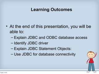 This document discusses Java Database Connectivity (JDBC) which provides Java applications with an API for accessing databases. It describes the four types of JDBC drivers: Type 1 uses JDBC-ODBC bridge, Type 2 uses native database APIs, Type 3 communicates through a middle-tier server, and Type 4 communicates directly via sockets. The document also outlines the basic steps to use JDBC for database connectivity including loading a driver, establishing a connection, creating statements, executing SQL, and processing result sets.