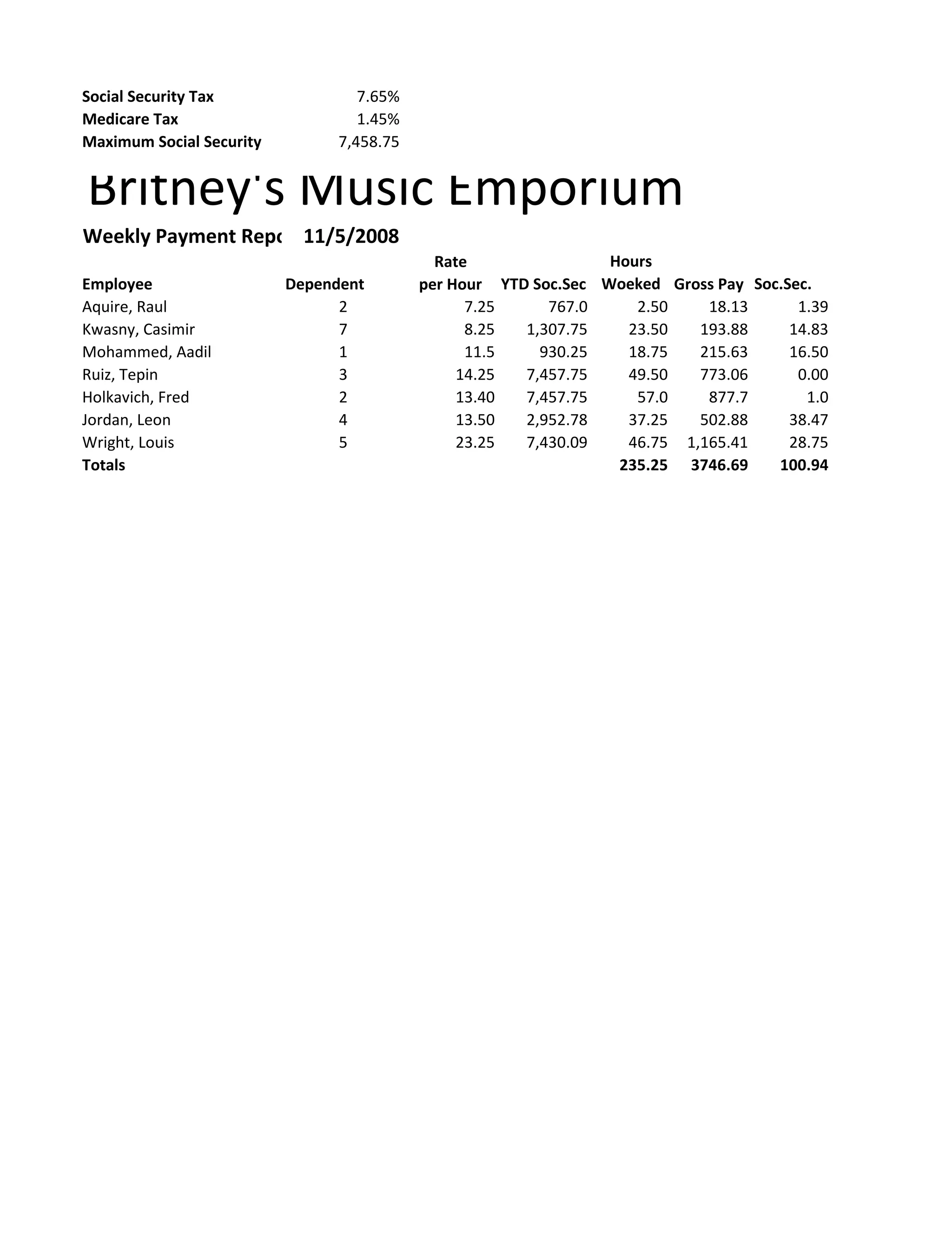 The document provides payroll information for employees at Britney's Music Emporium for the week ending 11/5/2008, including each employee's name, pay rate, hours worked, gross pay, Social Security taxes withheld, Medicare taxes withheld, federal taxes withheld, state taxes withheld, and net pay. It also includes totals for hours worked, gross pay, Social Security taxes, Medicare taxes, and federal taxes for all employees.