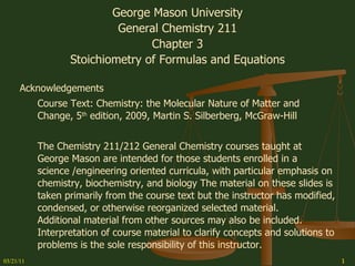 This document provides an overview of stoichiometry concepts covered in a George Mason University general chemistry course. It defines key terms like mole, molar mass, molecular weight, and formula weight. Examples are given for calculating the number of atoms or molecules in a given mass of a substance. The document also discusses mole-to-mole conversions in chemical equations, limiting reagents, and theoretical yield.