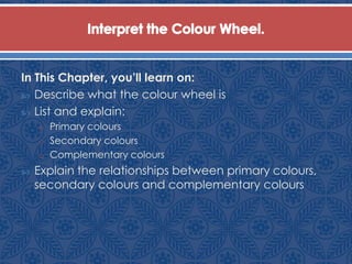 The document discusses the color wheel, which arranges color hues in a circle to illustrate the relationships between primary, secondary, and complementary colors. It defines primary colors as red, yellow, and blue that cannot be derived by mixing other colors. Secondary colors are formed by mixing two primary colors: orange, green, and violet. Tertiary colors lie between primary and secondary colors. Complementary colors are directly across from each other on the wheel and cancel each other out when mixed. The color wheel shows how primary, secondary, tertiary, and complementary colors are positioned and related.