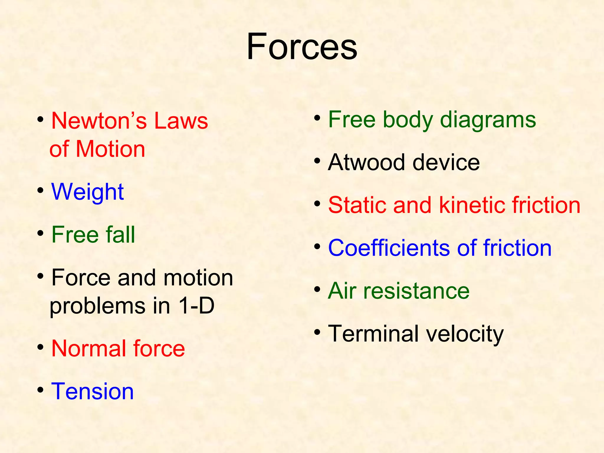 This document discusses Newton's laws of motion and provides examples of forces. It introduces Newton's three laws, including inertia, Fnet=ma, and action-reaction. Examples are given for each law such as an astronaut drifting in space (1st law), graphs of force vs. acceleration (2nd law), and collisions between objects of different masses (3rd law). Common forces like gravity, tension, and normal forces are also explained.