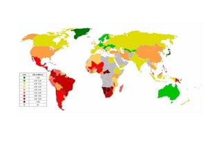 The document defines and explains the Gini coefficient, a measure of statistical dispersion used as a gauge of economic inequality. It is a ratio with a value between 0 and 1, with 0 representing perfect equality and 1 representing perfect inequality. The Gini coefficient is calculated based on the Lorenz curve, which plots cumulative incomes against the percentage of the population. The document provides various methods for calculating the Gini coefficient and discusses its advantages and limitations as a measure of inequality. It also includes a table ranking countries by their Gini coefficients.
