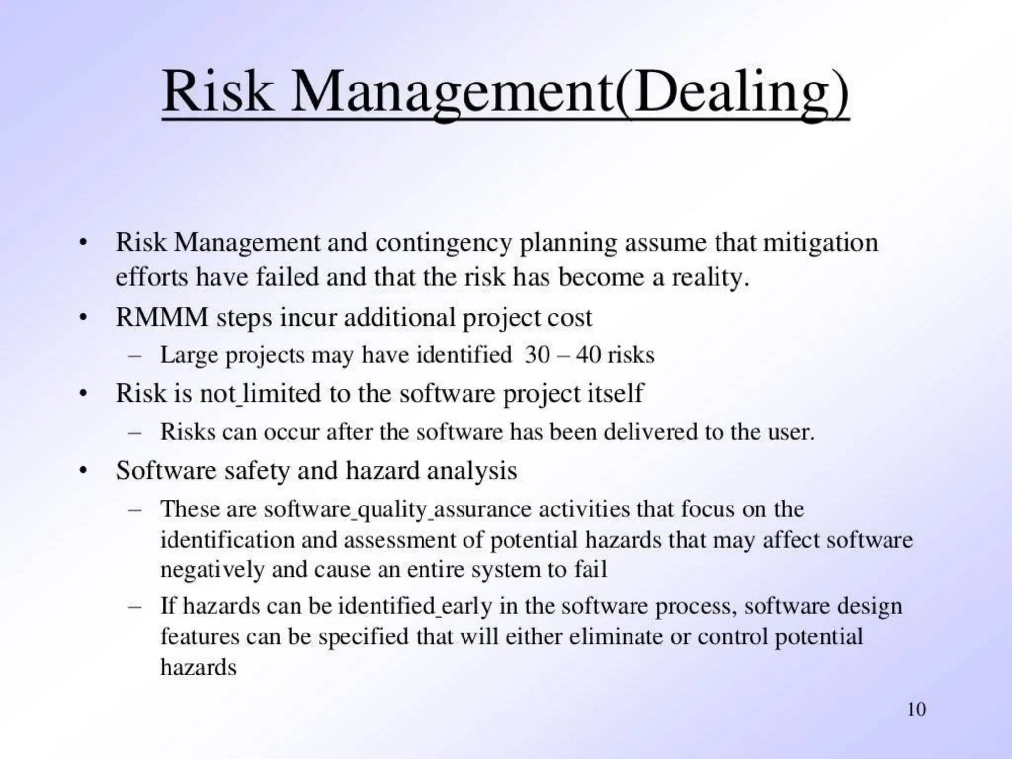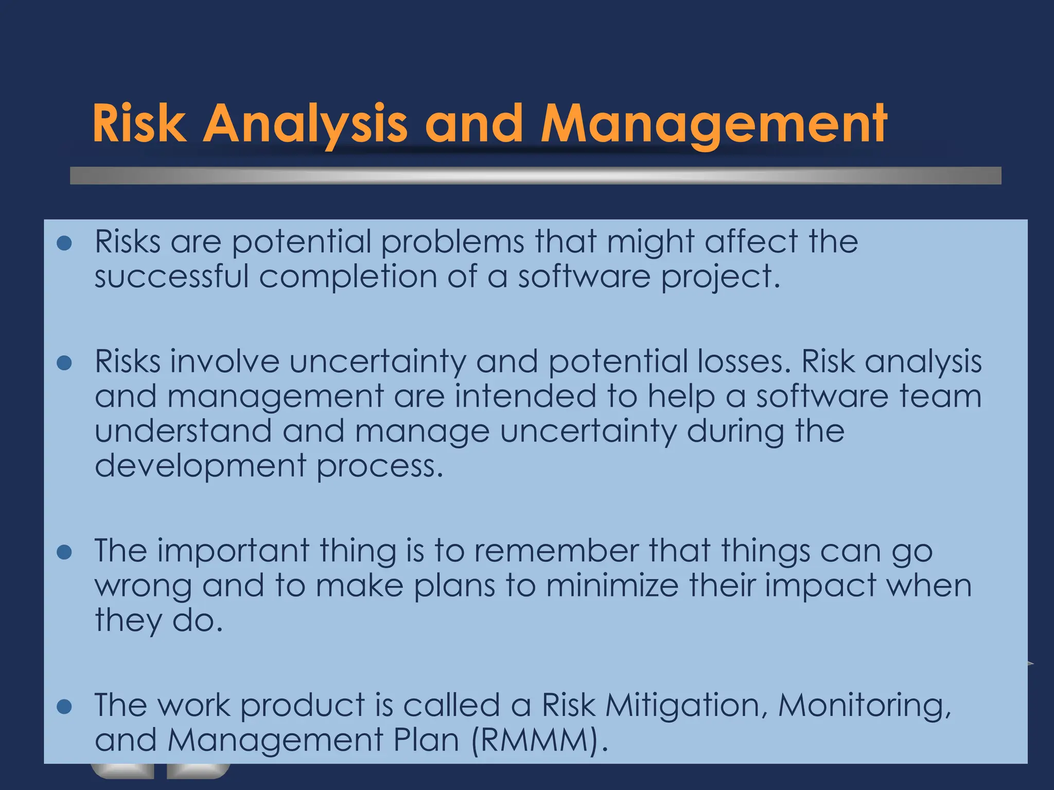 The document outlines risk analysis and management in software projects, emphasizing the importance of identifying, assessing, and managing potential risks through a structured plan (RMMM). It discusses various risk types, strategies for mitigation (reactive and proactive), and principles for effective risk management, including stakeholder communication and a continuous process of adapting to new information. Key elements include understanding project, technical, and business risks, along with steps for risk assessment and monitoring to ensure project success.