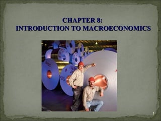 This document provides an introduction to macroeconomics. It discusses the key components and concerns of macroeconomics including inflation, output growth, unemployment, and income distribution. It also covers aggregate demand and supply, the circular flow model, and the roles of households, firms, government and the international sector in the macroeconomy. Government policies aim to achieve price stability, economic growth, full employment, and an equitable distribution of income.