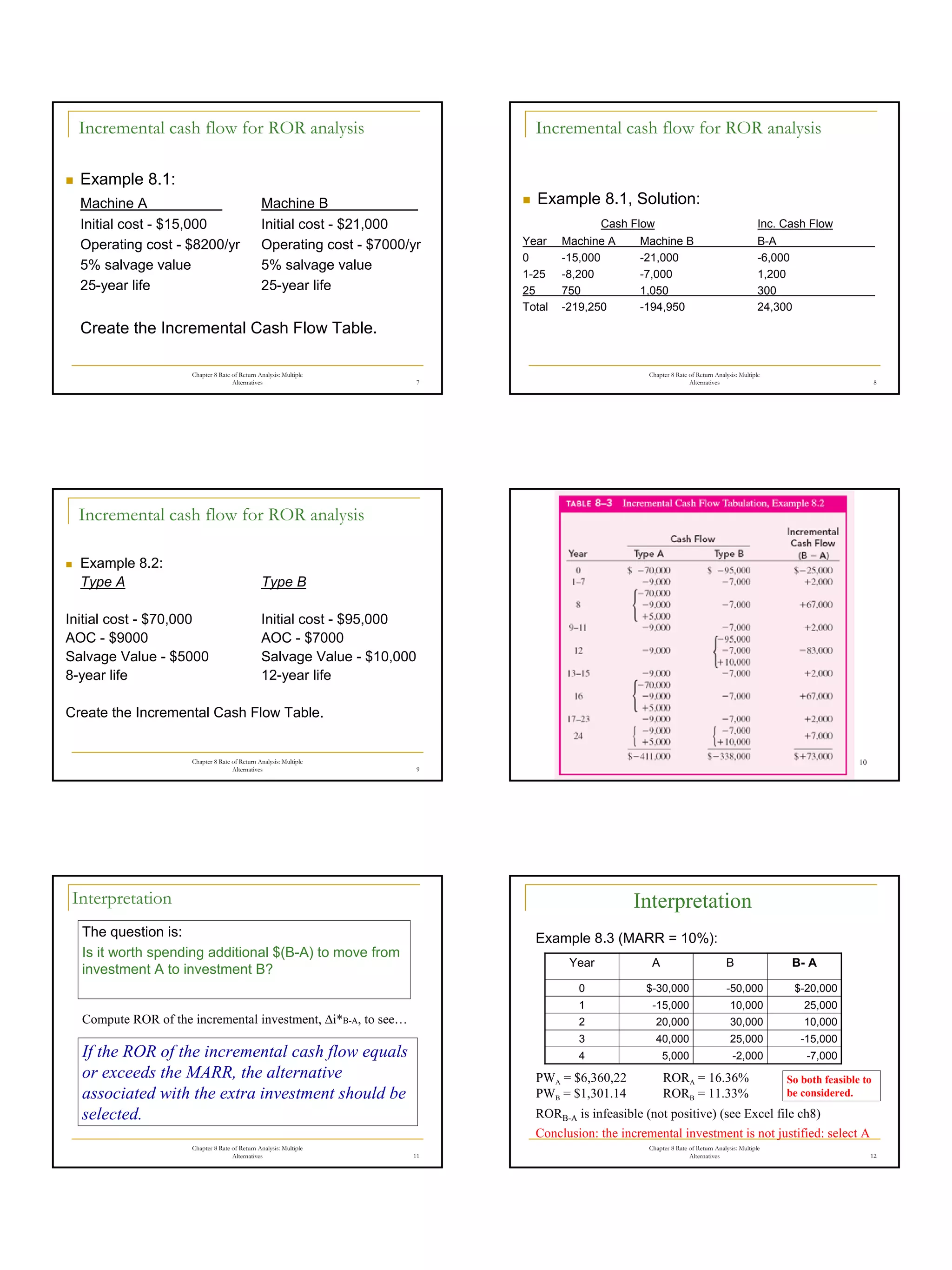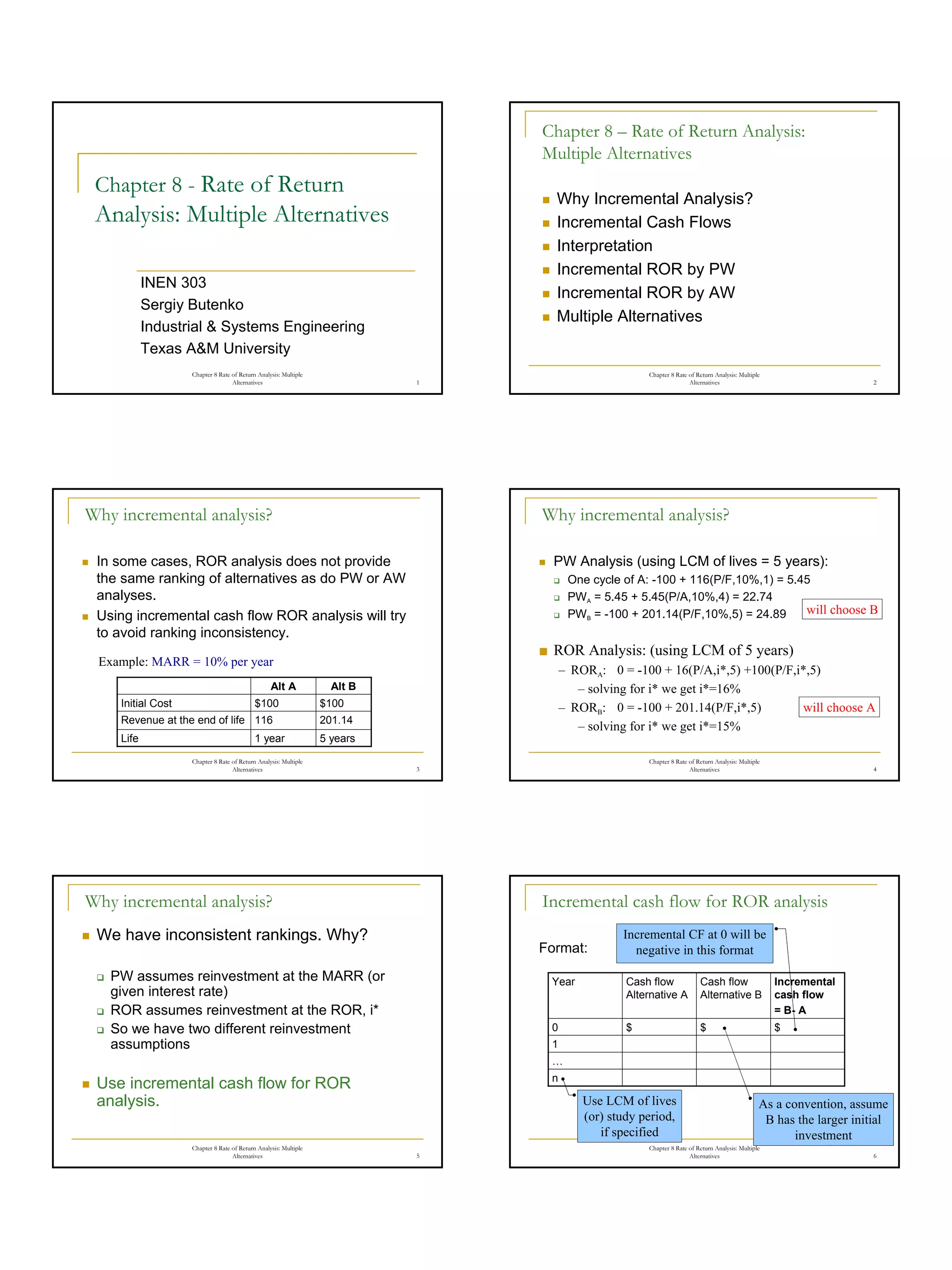 This document discusses incremental rate of return analysis for multiple alternatives. It explains that incremental analysis avoids inconsistent rankings that can occur when alternatives have different lives. Incremental cash flows are calculated as the difference between alternatives' cash flows. The rate of return for the incremental cash flows (Δi*) is computed and compared to the minimum acceptable rate of return to determine which alternative provides the higher return. The analysis can be done using present worth of incremental cash flows or using annual worth of total cash flows for one life cycle.