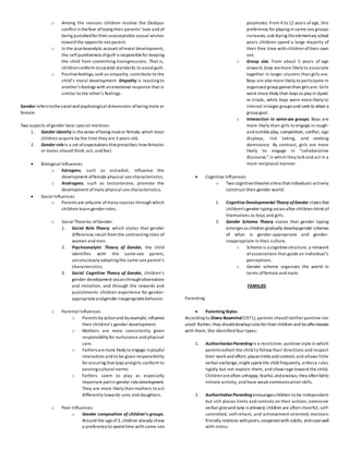 - Gender development influenced by biological factors and socialization by parents and peers.