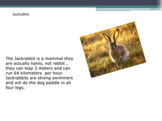 The document provides information on various animals found in chaparral ecosystems through short paragraphs on each species. It describes the jackrabbit's ability to leap long distances and run fast, while also being a strong swimmer. For the Mexican gray wolf, it notes its small size and resemblance to European wolves. The cactus wren is described as the largest North American wren with distinguishing markings. Three sentences is not enough to fully summarize the key details about each of the 17 animals covered.