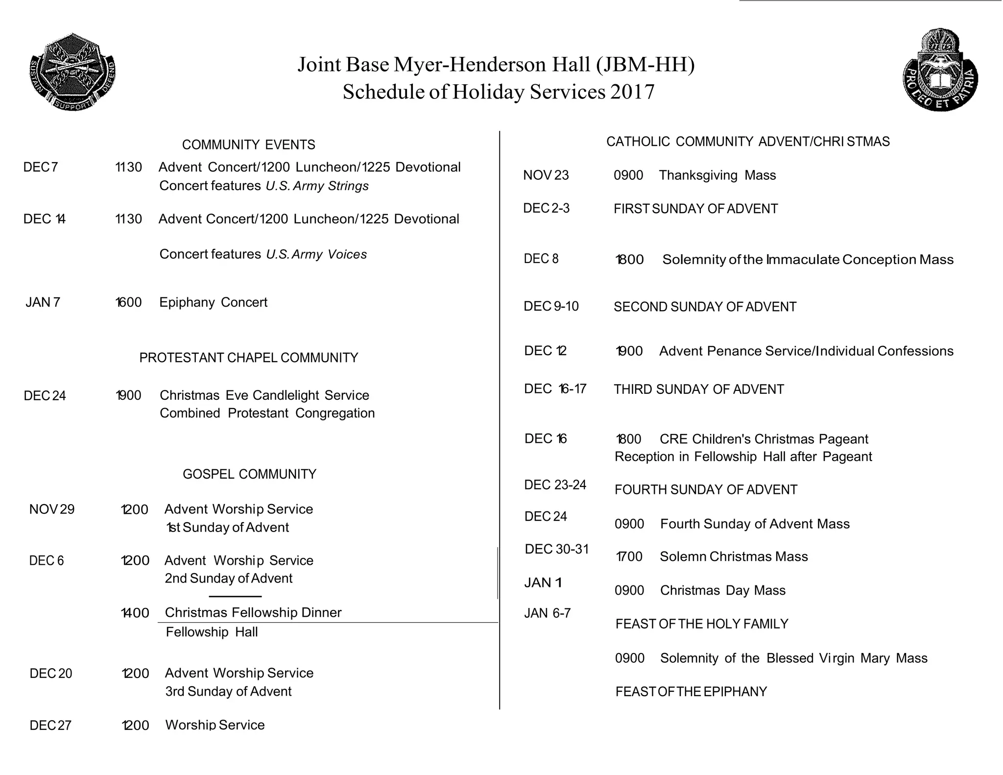 This document provides the schedule of holiday services for 2017 at Joint Base Myer-Henderson Hall, including Advent concerts on December 7th and 14th featuring the U.S. Army Strings and U.S. Army Voices respectively, Catholic masses on Thanksgiving and various Sundays in December, a Protestant candlelight Christmas Eve service, a children's Christmas pageant on December 16th, Christmas Eve and Christmas Day masses, and Epiphany services in early January across the Catholic, Protestant, and Gospel communities on the base.