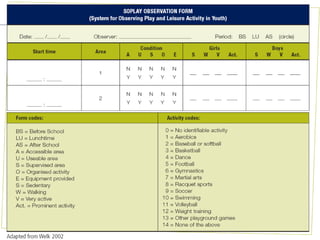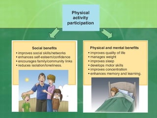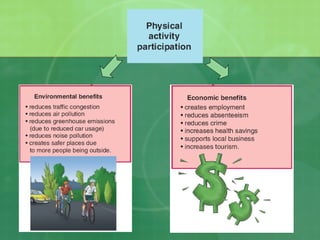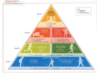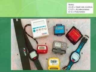 The document summarizes national physical activity guidelines and methods of assessing physical activity. It provides recommendations for different age groups, discusses barriers to participation, and describes various subjective and objective methods for measuring physical activity, including surveys, pedometers, accelerometers, and doubly labeled water testing.