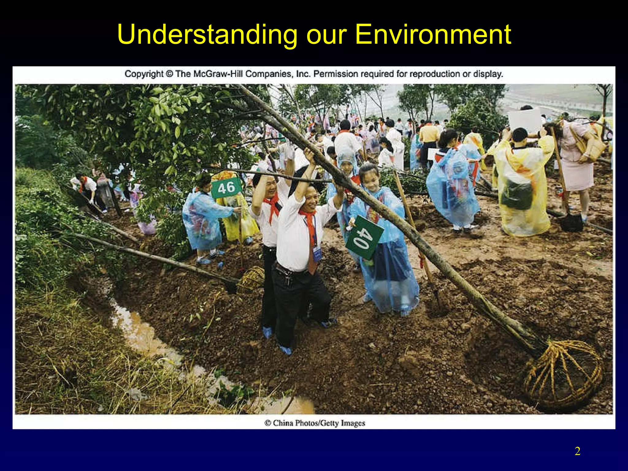 1) It outlines current environmental conditions such as issues related to population, water, food, climate change, air pollution, and biodiversity.